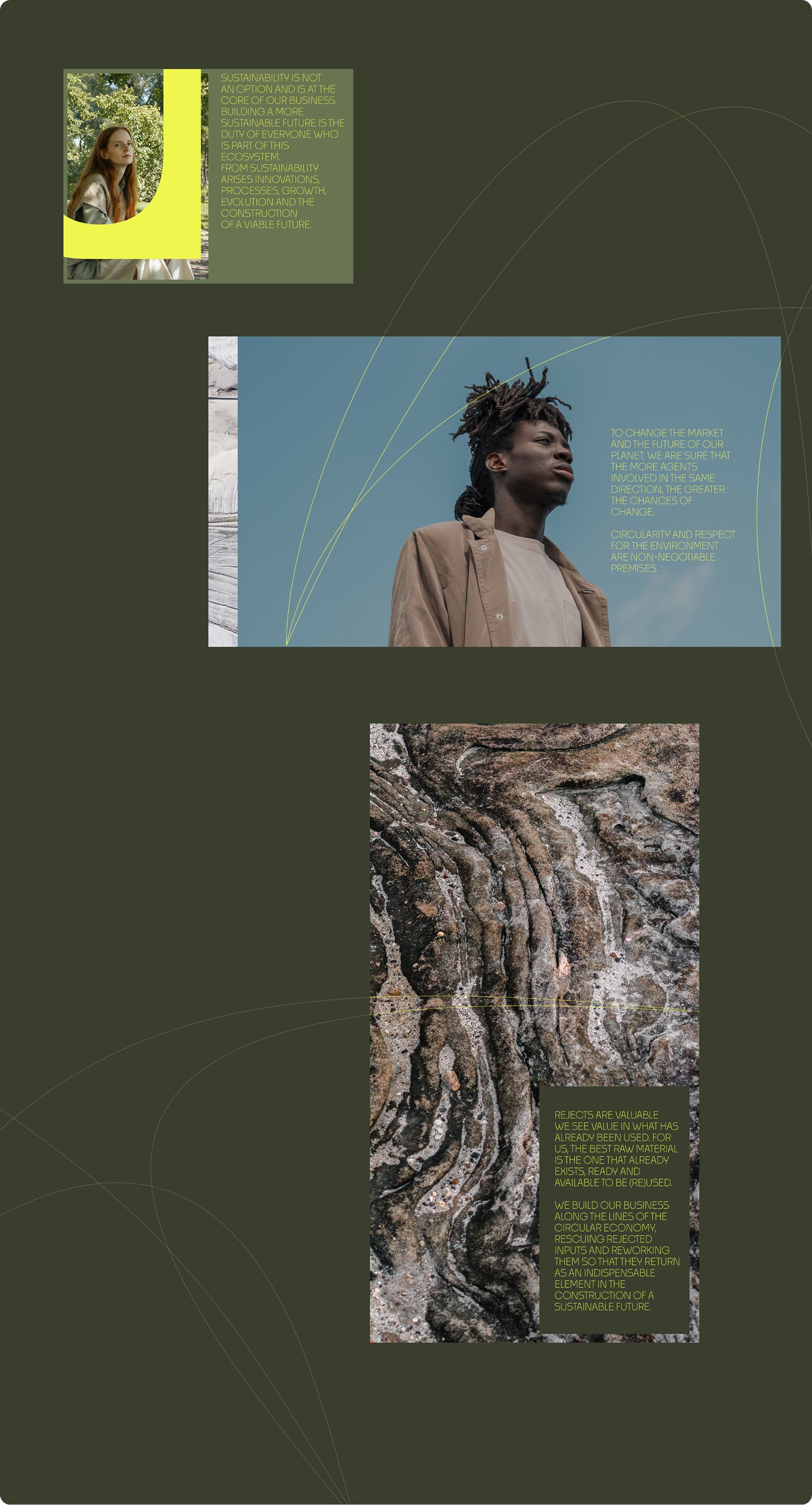 The photographic style was chosen to be sunny, natural, and full of life. nature texture pictures were also used to show awareness of the beauty of the materials – either in a raw state or used, the latter for Circlua being of great value. after all, the best raw material is one that is already in use, ready to be recycled.