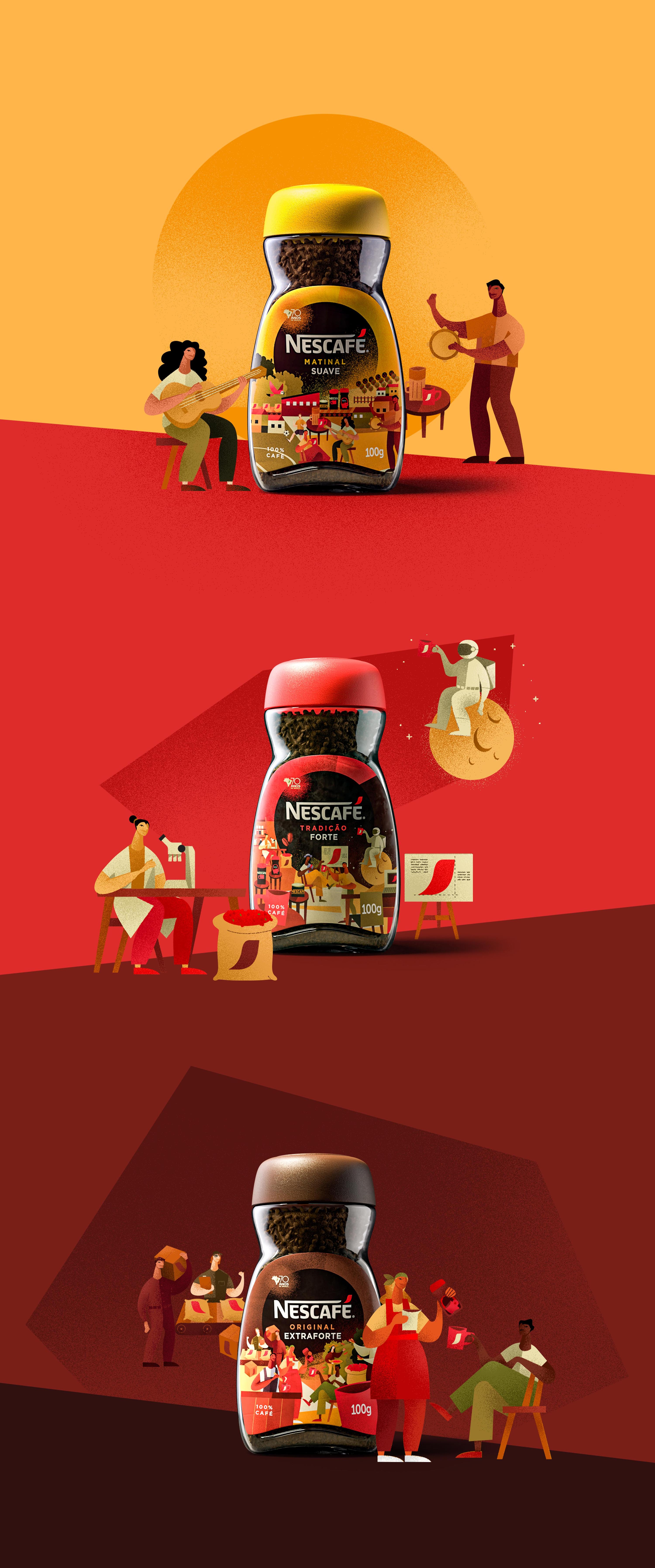 Still on the labels, the themes are organized by product line: Nescafé Tradicional (red) talks about topics related to Nescafé's innovation, Nescafé Original presents data about the production chain—from sustainability practices to professionals and customers—and the Nescafé Matinal label highlights the people who are part of the coffee chain.